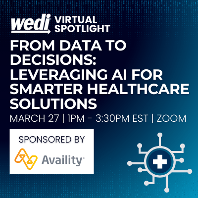 Join WEDI for an exciting virtual spotlight event, From Data to Decisions: Leveraging AI for Smarter Health Care Solutions, sponsored by Availity, designed specifically for health care IT professionals. This engaging event will feature expert presentations and a dynamic panel discussion showcasing the current state of artificial intelligence integration in healthcare. Discover how AI is driving innovation, improving operational efficiency, and enhancing patient outcomes while addressing key challenges such as data quality, interoperability, and ethical considerations.